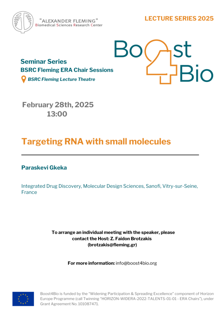 Don’t miss this week’s B.S.R.C. Alexander Fleming ERA Chair Scientific Seminar entitled: “Targeting RNA with small molecules” by Paraskevi Gkeka from Integrated Drug Discovery, Molecular Design Sciences, Sanofi, Vitry-sur-Seine, France.